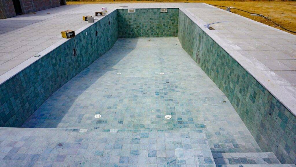 7. Finishing: After the grout has dried, use a damp sponge to clean the surface of the Sukabumi green stone and remove any excess grout. Allow the grout to dry completely before filling the pool with water.